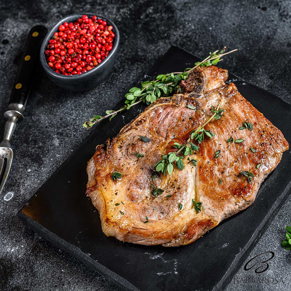 Ceafa porc Bazna este una dintre cele mai apreciate taieturi de porc, usor de recunoscut prin culoarea roz-rosiatica a carnii dar si pentru suculenta sa naturala si gustul autentic. Obtinuta din porci Bazna crescuti traditional, aceasta carne se remarca prin continutul echilibrat de grasime, care asigura fragezime si savoare in timpul gatirii.