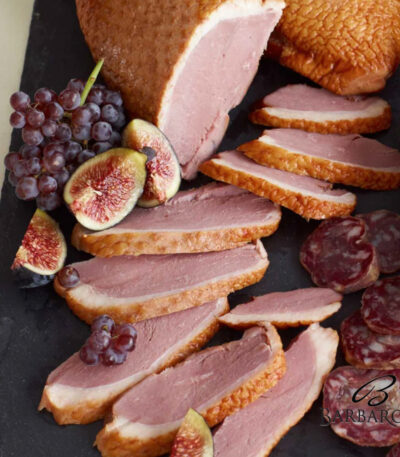 Pieptul de rata afumat este un produs rafinat, realizat artizanal in inima Bucovinei, dupa retete traditionale care pun in valoare gustul autentic al carnii de rata. Afumarea lenta pe lemn de esenta tare ii confera o aroma echilibrata si o textura frageda, pastrand in acelasi timp savoarea naturala a carnii. Este ideal pentru platouri cu mezeluri fine, salate calde sau sandwich-uri gourmet, acest produs aduce in farfurie o experienta gustativa de exceptie.\n\nProdus 100% natural, fara E-uri, fara conservanti si fara aditivi. Realizat manual, in cantitati limitate, din carne curata, provenita din ferme locale din Bucovina.\n\nIngrediente: piept de rata, sare, condimente naturale.\n\nValori nutritionale medii / 100g: Valoare energetica 980 kJ / 235 kcal, Grasimi 16g (din care acizi grasi saturati 4.5g), Proteine 22g, Carbohidrati 0g (din care zaharuri 0g), Sare 2.3g